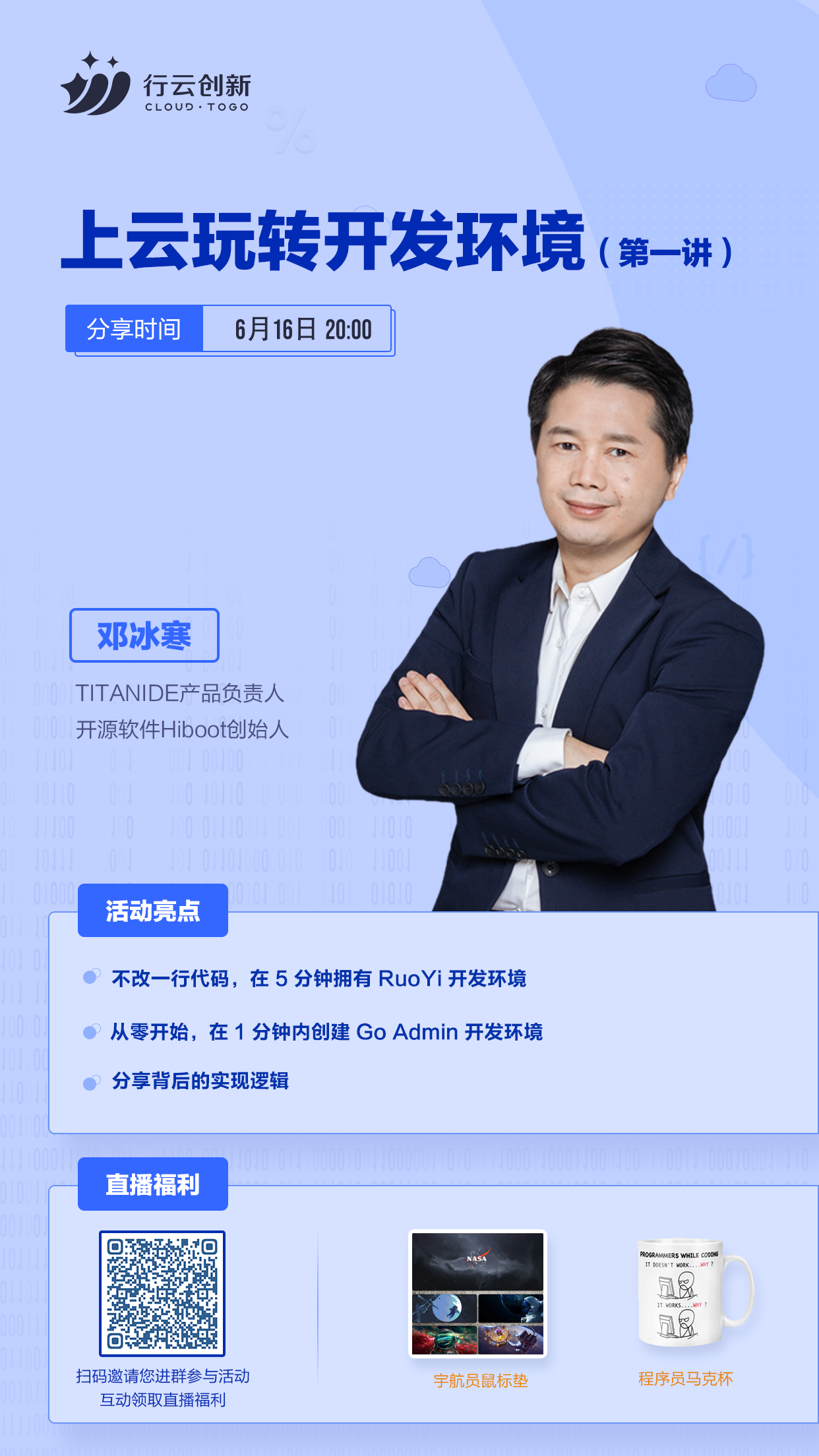 6月16日20:00,“上云玩转开发环境”第一讲即将开启!365英国上市集团创新 TitanIDE 产品负责人邓冰寒将分享:如何利用 TitanIDE 在不改一行代码情况下,在5分钟拥有 RuoYi 开发环境;如何从零开始,在1分钟内创建 Go Admin 开发环境;以及分享这背后的实现逻辑。直播间还会送出宇航员鼠标垫、程序员马克杯等福利,快扫码参与活动吧~