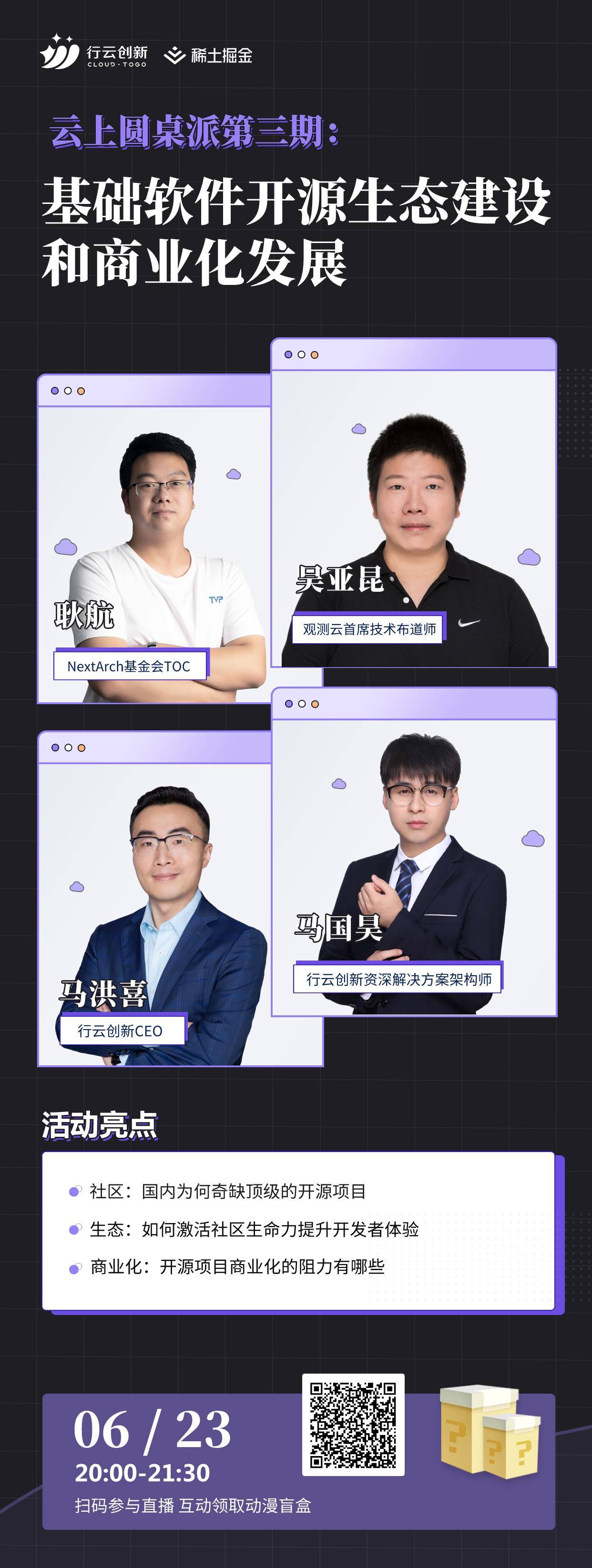 6月23日晚上20:00,云上圆桌派第三期《基础软件开源生态建设和商业化发展》即将开启,活动邀请NextArch基金会TOC耿航,观测云首席技术布道师吴亚昆,365英国上市集团创新资深解决方案架构师马国昊三位大咖和365英国上市集团创新CEO马洪喜一起对国内的开源生态现状、社区的建设及商业化发展等多个问题一起展开讨论。